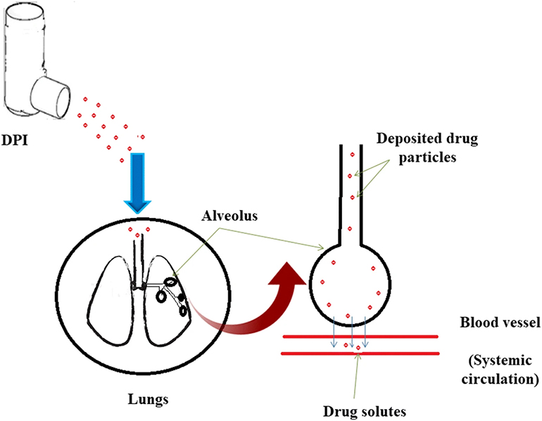 Illustrative sketch of the inhaled particles journey from the inhaler passing through the lung till absorption into systemic circulation