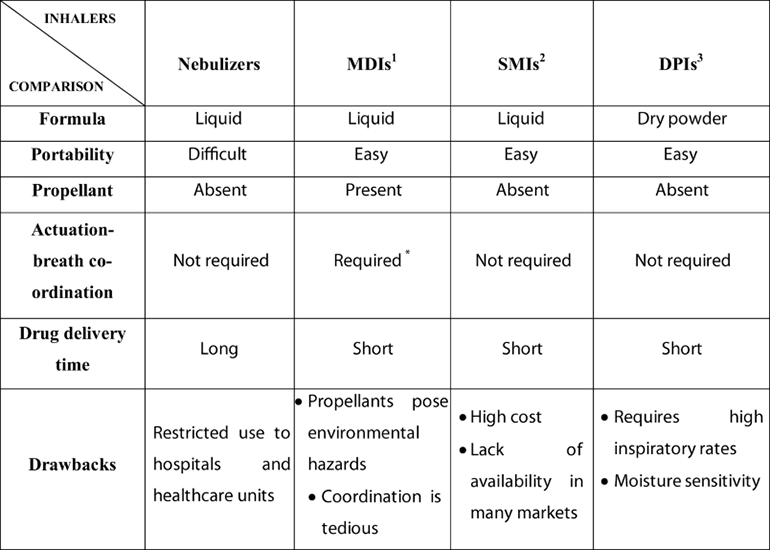 Nebulizers aerosolize liquid solutions, and do not require propellants or actuation-breath coordination. Metered-dose inhalers (MDIs) deliver a liquid formula through a metering valve in the device and require actuation-breath coordination. Soft mist inhalers (SMIs) require no propellant nor coordination of actuation and breathing while still administering the drug quickly and effectively. DPIs rely on the patient’s inspiration but do not require actuation-breath coordination. The following table provides an comparison between these different devices.