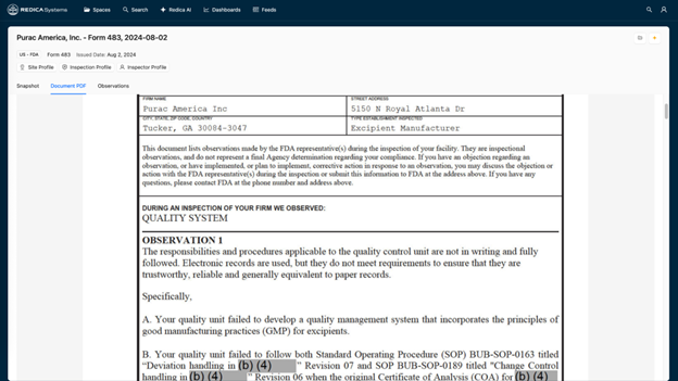 Figure 2. Purac America, Inc. Form 483 in the Redica Systems Platform